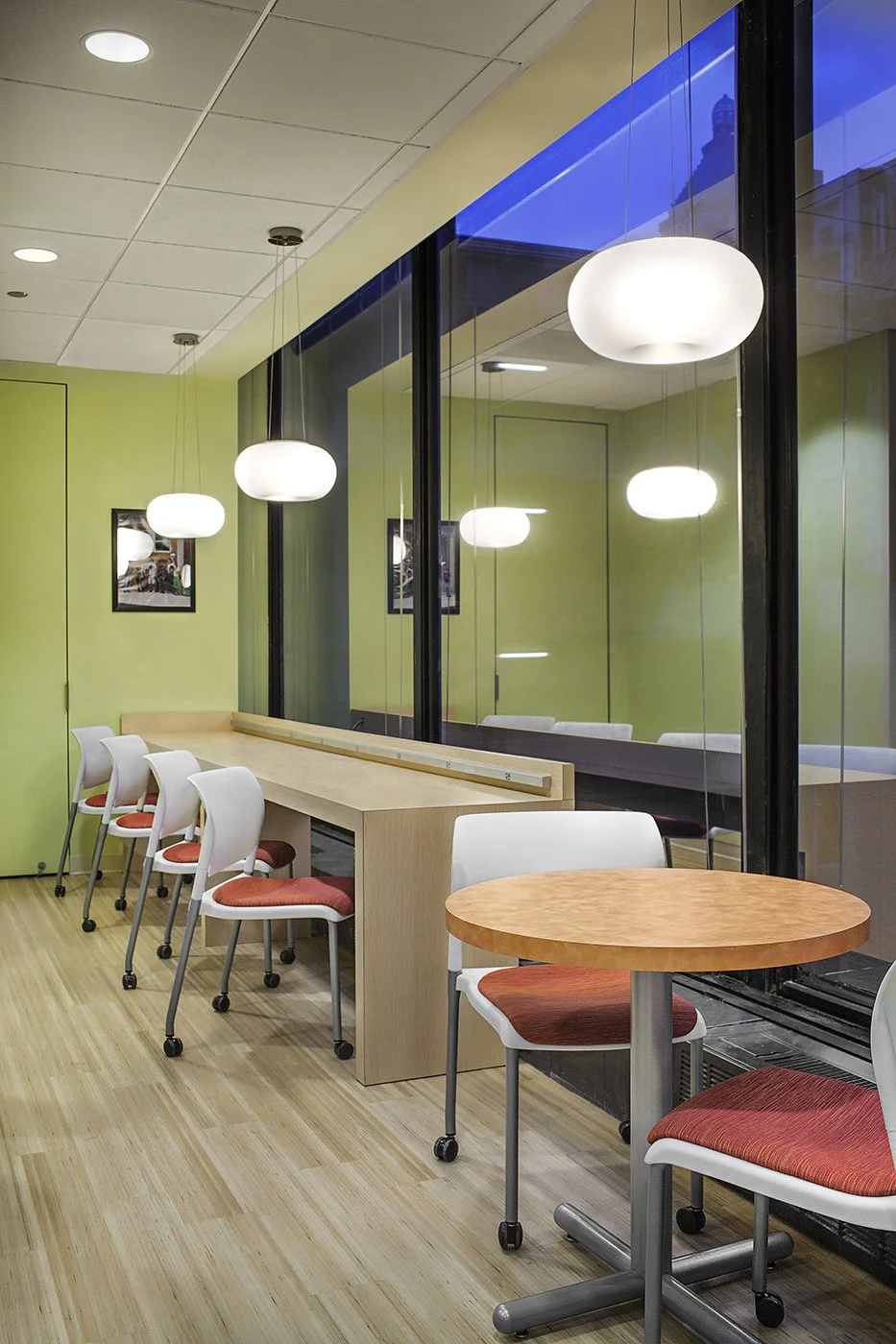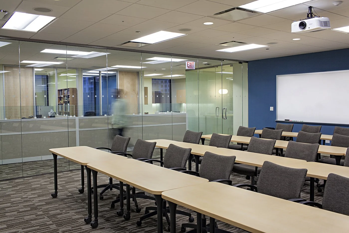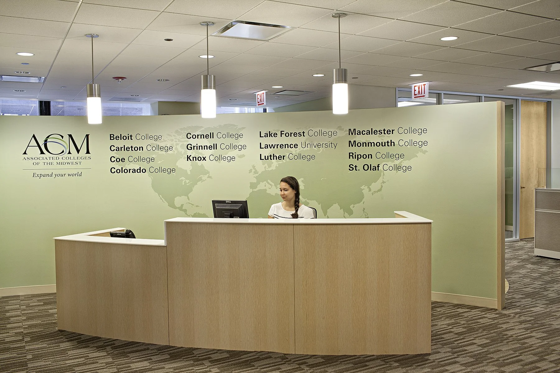This office was designed for the Associated Colleges of the Midwest in the Chicago loop. The office is multi-use divided into two separate areas. The first half of the floor plan is used for the college with two large classrooms, study areas, lounge, and private offices for professors. The back half of the floor plan is the corporate office side responsible for overseeing and managing operations. The space incorporated dynamic curved walls, a chalk friendly paint coating in the lounge, accent colors to evoke creativity and light woods were used to give the space a spacious warm aesthetic.
