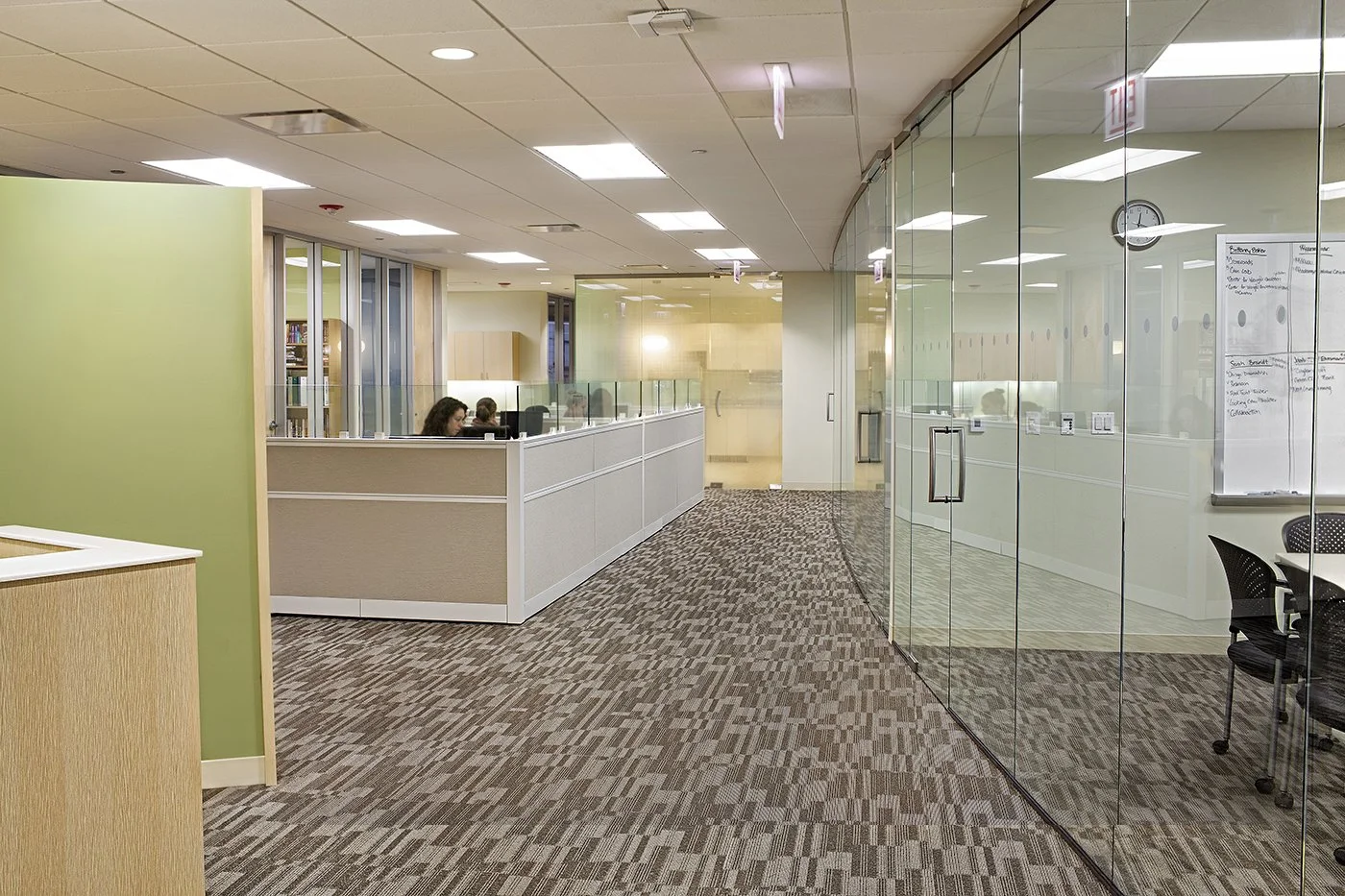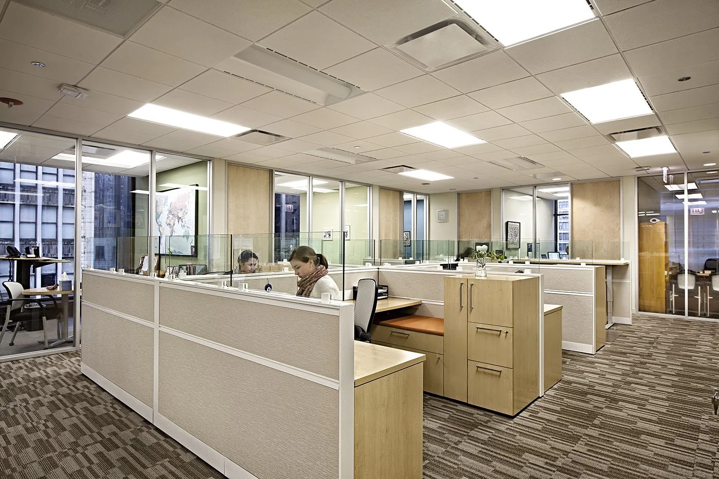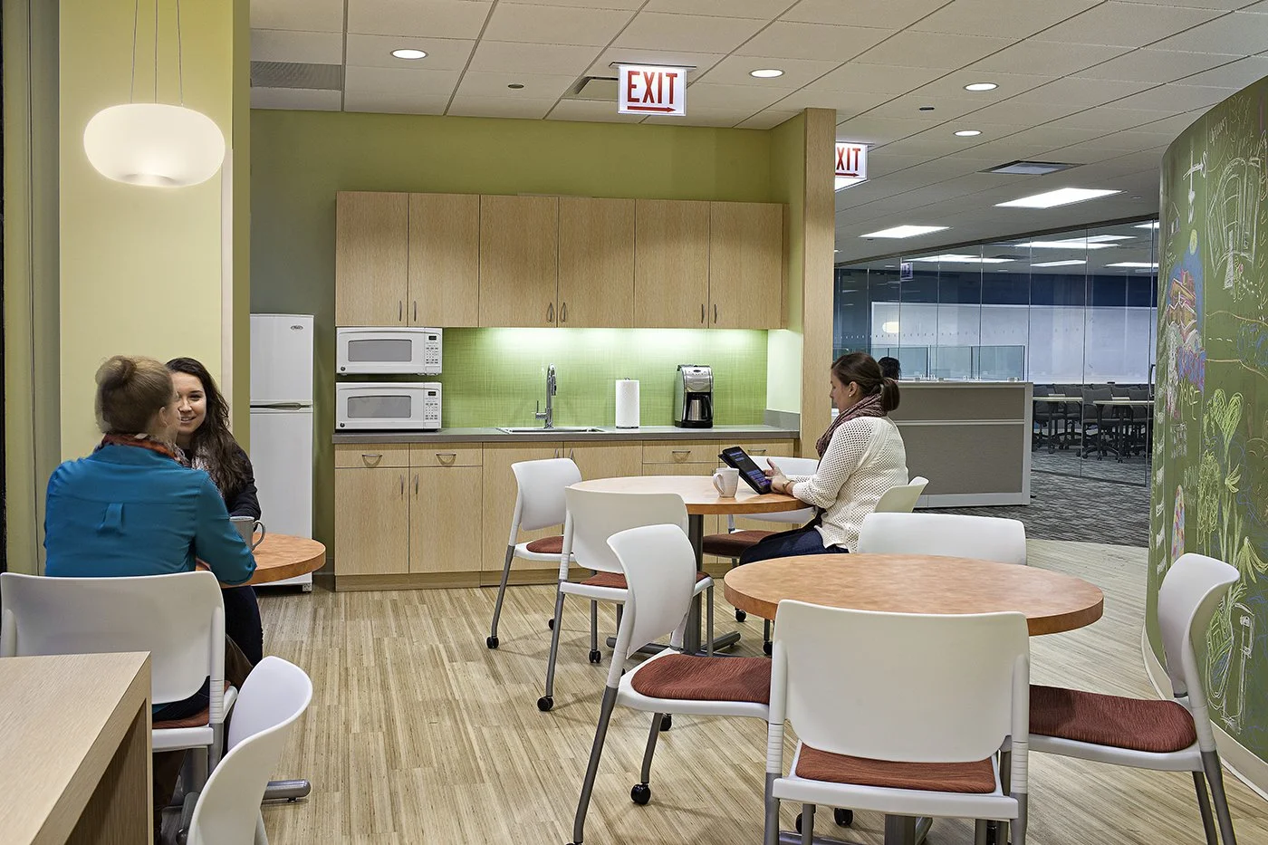 This office was designed for the Associated Colleges of the Midwest in the Chicago loop. The office is multi-use divided into two separate areas. The first half of the floor plan is used for the college with two large classrooms, study areas, lounge, and private offices for professors. The back half of the floor plan is the corporate office side responsible for overseeing and managing operations. The space incorporated dynamic curved walls, a chalk friendly paint coating in the lounge, accent colors to evoke creativity and light woods were used to give the space a spacious warm aesthetic.