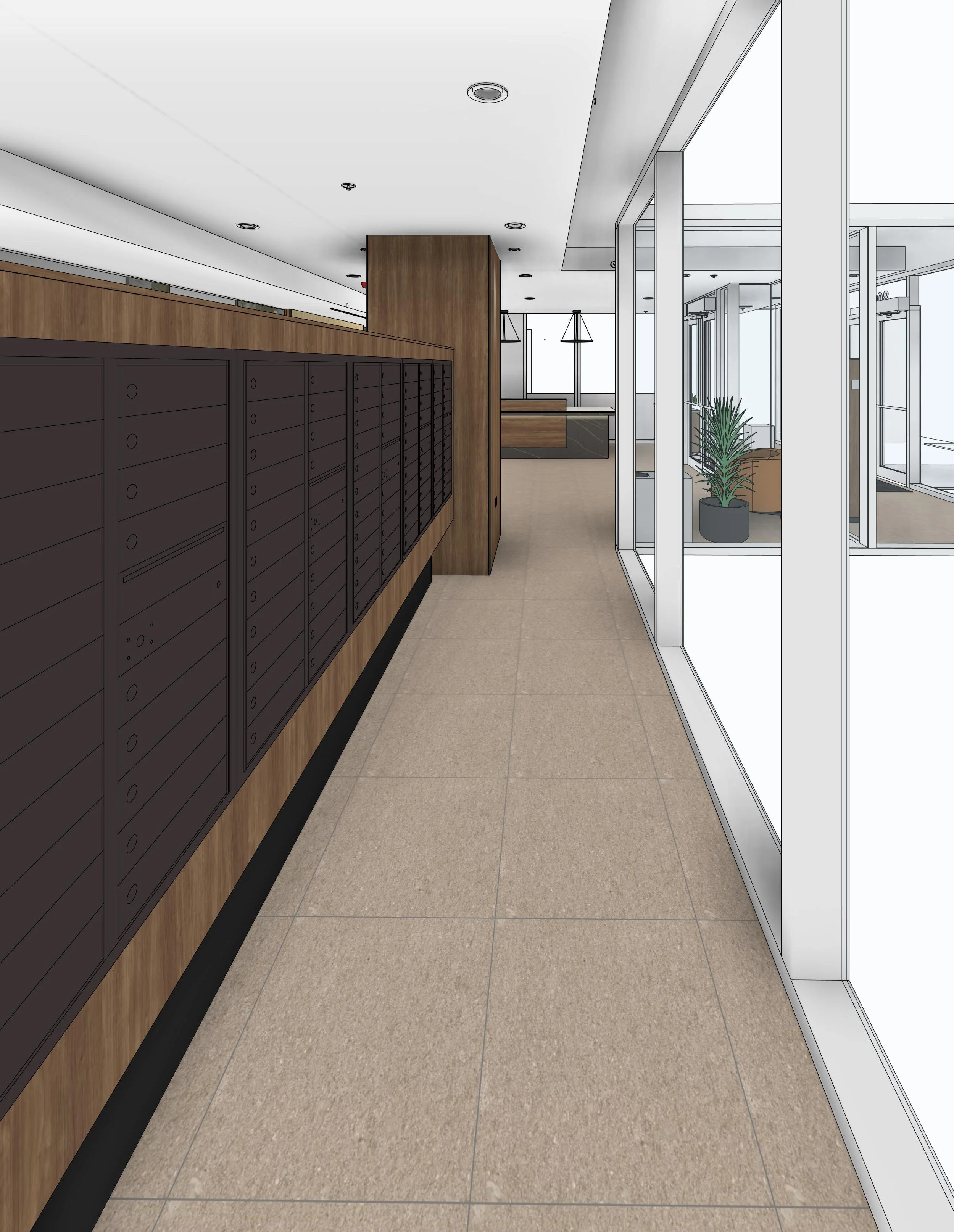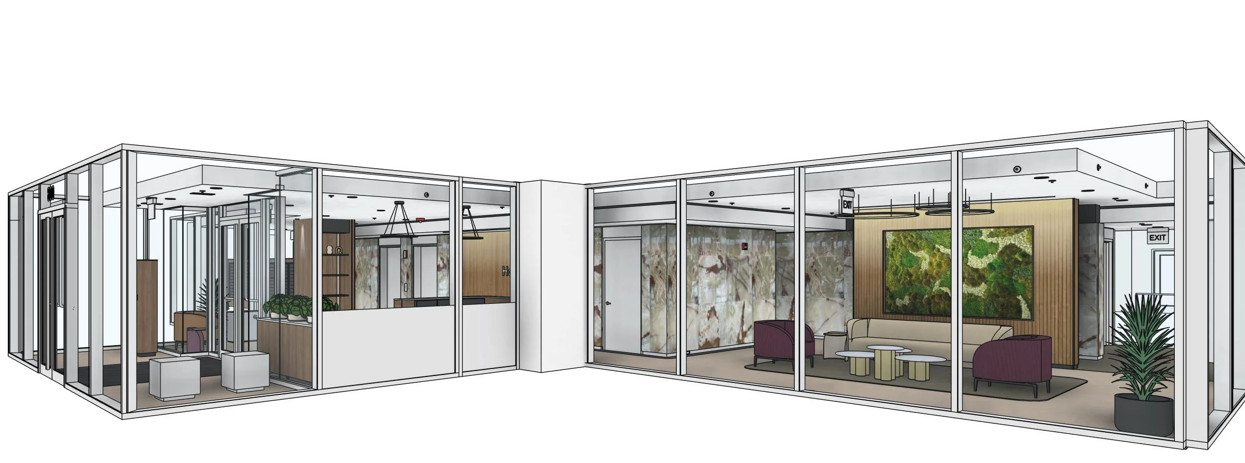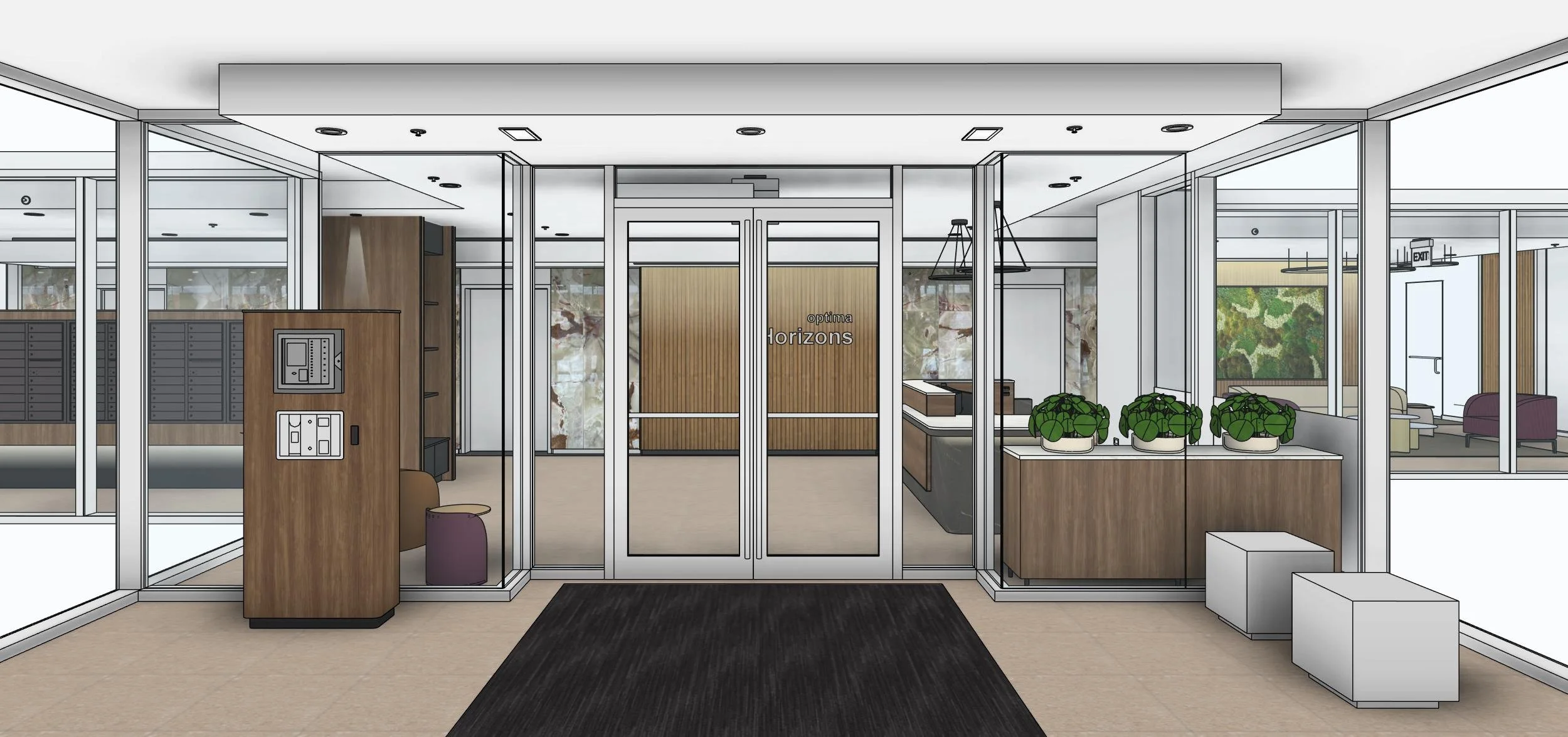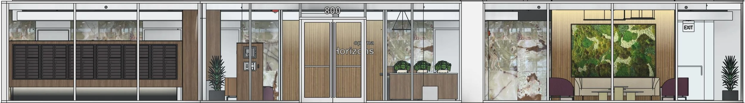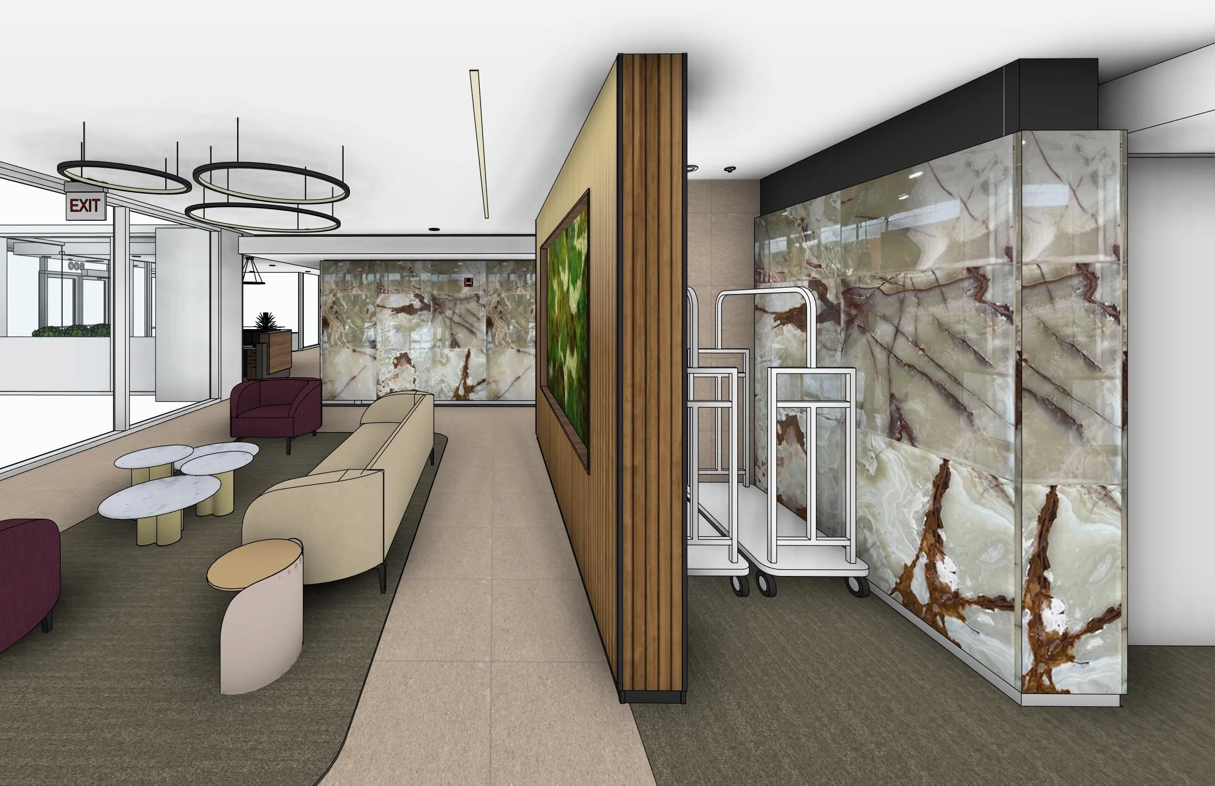 TZS Design is reimagining the lobby at Optima Horizons, an architecturally unique building that calls for an equally distinctive interior. The renovation addresses key issues like package overflow, poor circulation, and awkward security desk placement. Upgrades include a new double-door storefront, mail area, security desk, package room, luggage cart storage, updated restroom, and a more welcoming layout for residents. The original onyx stone panels—bold and full of character—remain as a striking backdrop. The new design embraces a warm minimalist approach that complements the stone and introduces clean, impactful elements. A recessed moss wall in the lounge anchors the space with a natural focal point, bringing beauty and calm indoors.