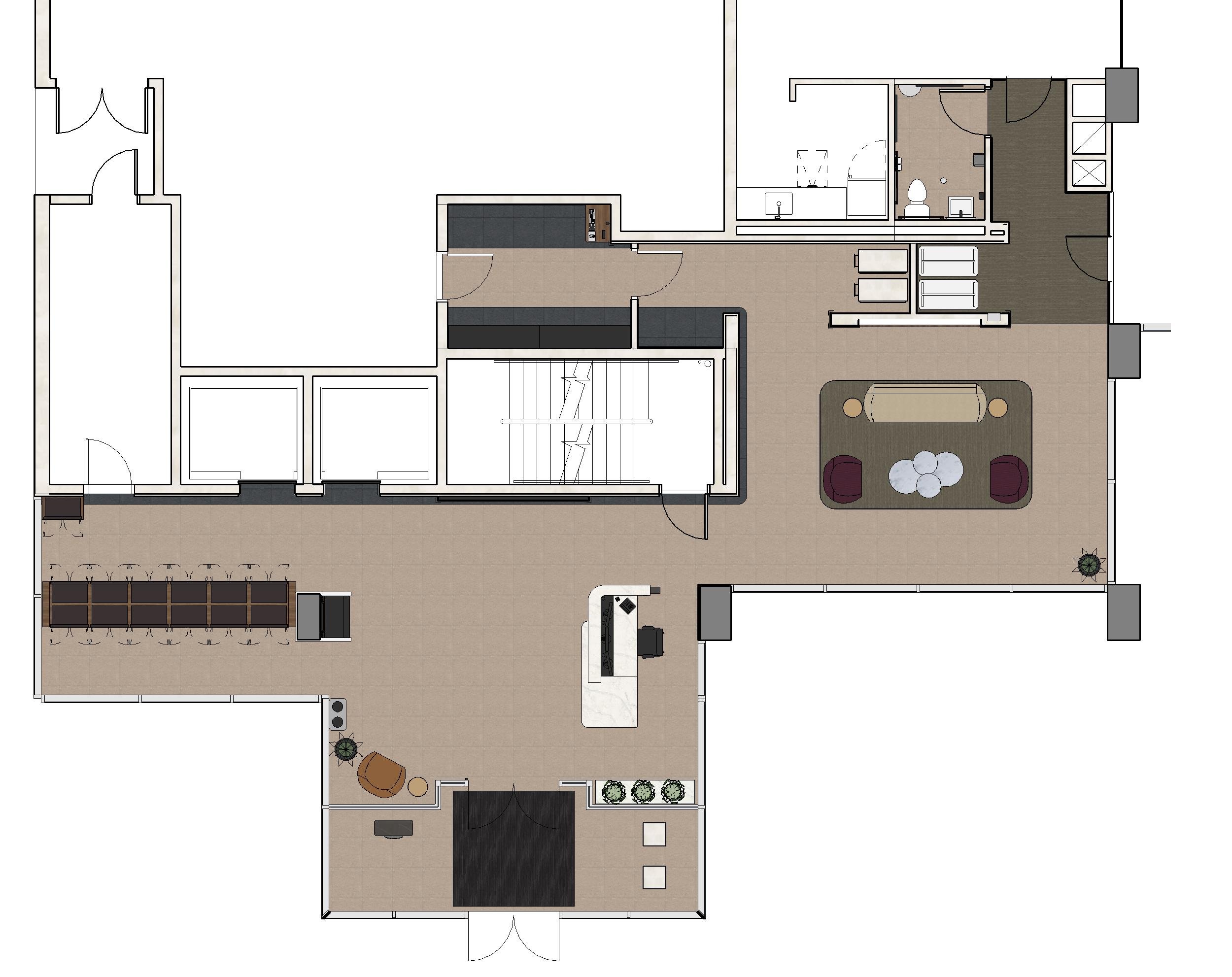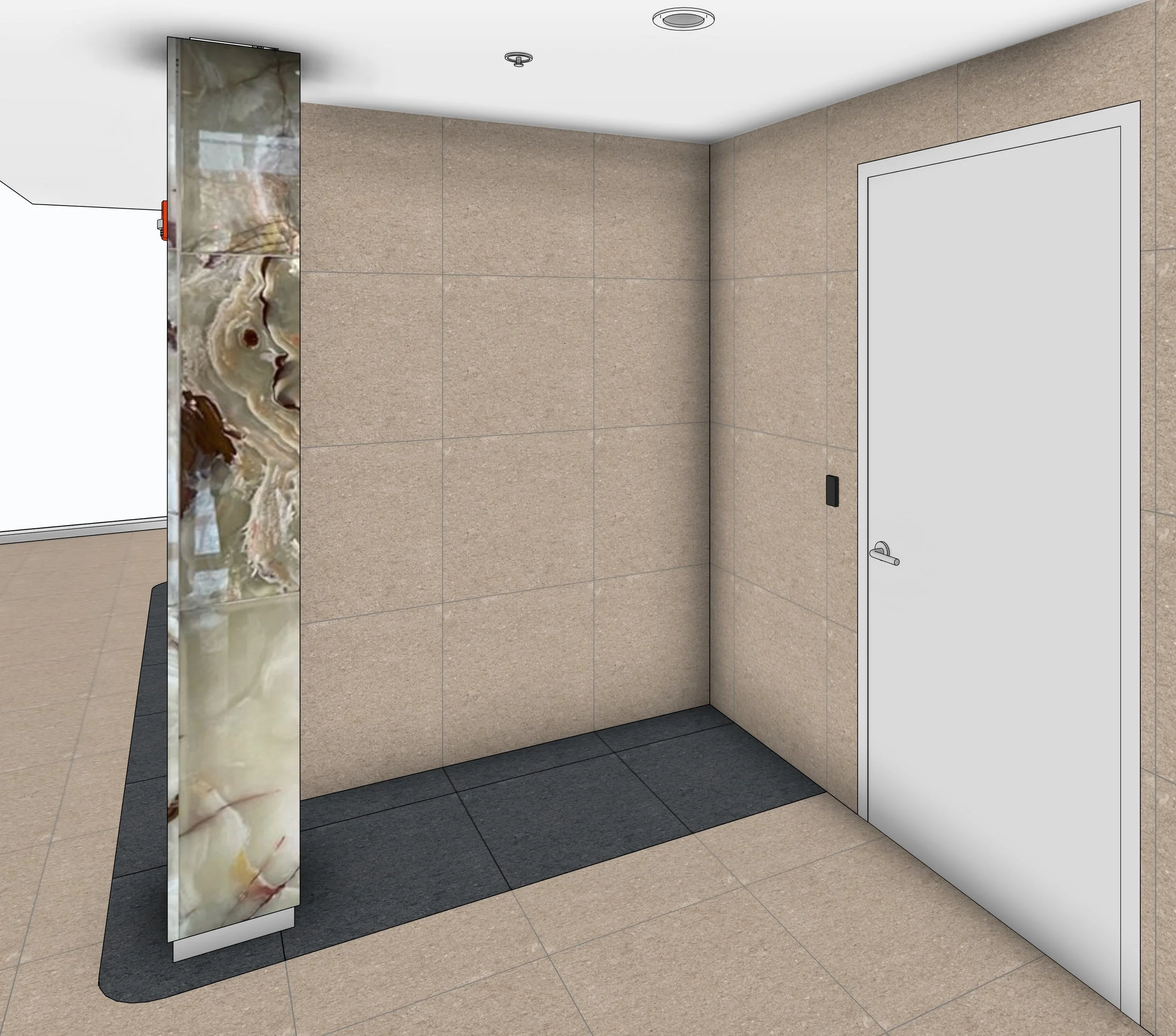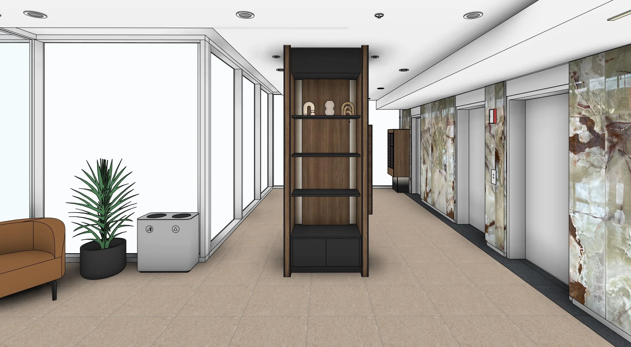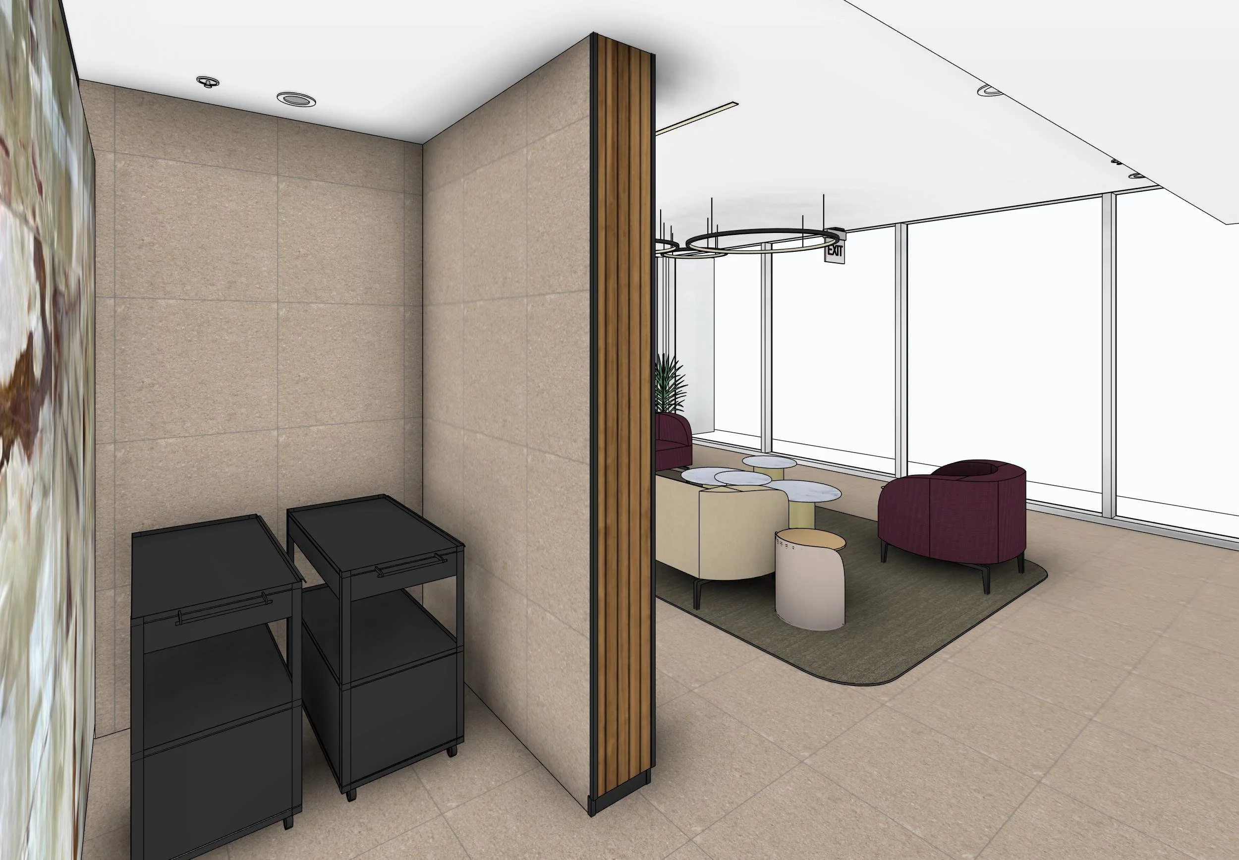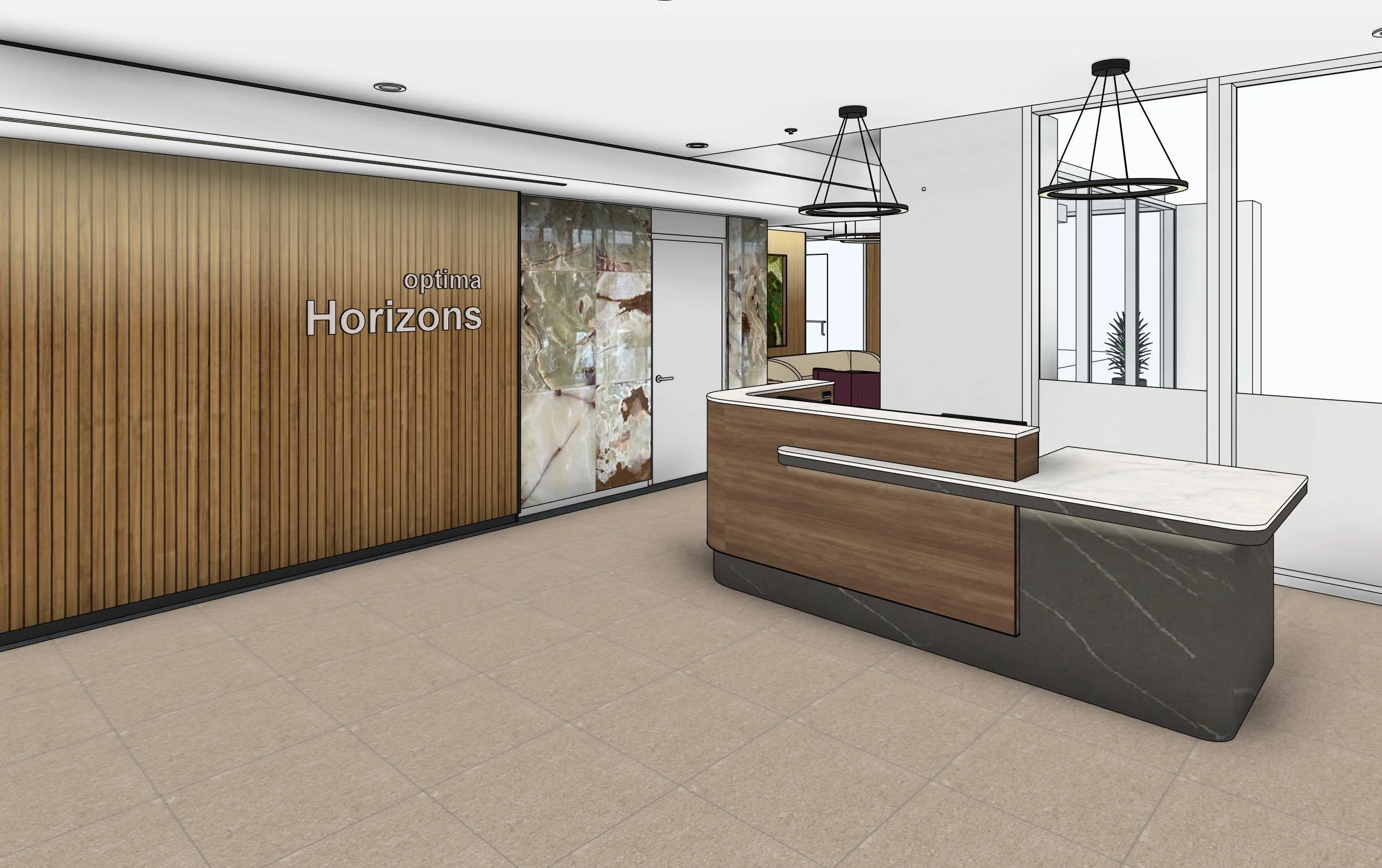TZS Design is reimagining the lobby at Optima Horizons, an architecturally unique building that calls for an equally distinctive interior. The renovation addresses key issues like package overflow, poor circulation, and awkward security desk placement. Upgrades include a new double-door storefront, mail area, security desk, package room, luggage cart storage, updated restroom, and a more welcoming layout for residents. The original onyx stone panels—bold and full of character—remain as a striking backdrop. The new design embraces a warm minimalist approach that complements the stone and introduces clean, impactful elements. A recessed moss wall in the lounge anchors the space with a natural focal point, bringing beauty and calm indoors.