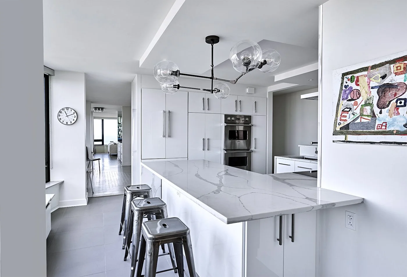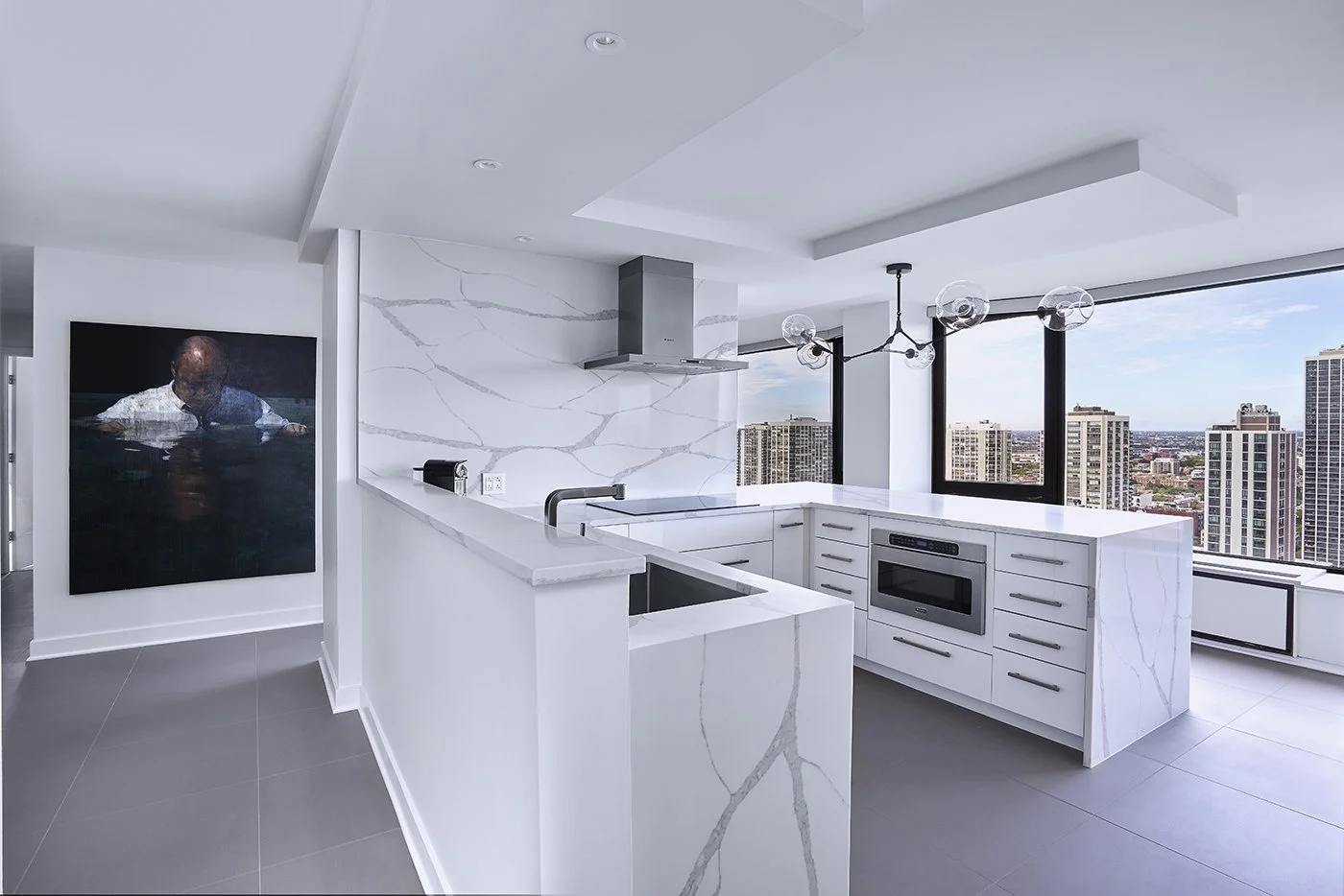 This partial condo renovation emphasized a gallery-like atmosphere for an art collector. A neutral palette of white and gray complements the displayed art. The open kitchen design maximizes the panoramic view of Lincoln Park by omitting wall cabinets and employing minimalist appliances. The master bathroom suite features white marble tile walls, white washed oak wood veneer cabinetry, walk-in shower, vessel tub, sauna, and private water closet.